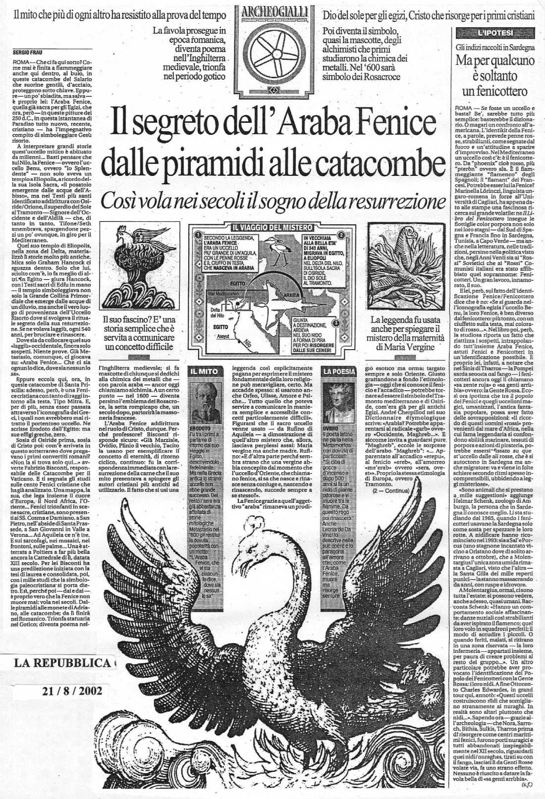 Preferii lasciar perdere e mi attaccai alla seconda delle reminiscenze, che, sottoposta ad intensi sforzi cerebrali, finì per rivelarsi meno nebulosa del previsto. Riguardava il regolamento di conti tra Perseo e la Medusa. Già pregustavo la possibilità di ricavarci quattro chiacchiere sull’impegno umano a misurarsi con le imprese più ardue, quando spuntò l’imprevisto. Che c. aveva in testa la Medusa ? Il quarto d’ora successivo alla folgorazione mi tenne impegnato nell’enigma. Scartai d’istinto l’ipotesi capelli ritenendoli scarsamente idonei alla pietrificazione del prossimo (a quei tempi non c’erano ancora le parrucchiere di Nefertari n.d.r.). La scelta finì per restringersi tra vermi e serpenti. Stavo per tentare la sorte giocandomi la prova a testa e croce, quando mi si materializzò per il capo la terza visione; quella d’una vampata che determinava la partenza a razzo d’un mitico uccello. Un animale che, invece di fare la fine del tordo allo spiedo, usava le fiamme per rigenerarsi ed approdare a nuova vita. Unico intoppo: quello di stabilire la specie d’appartenenza della bestiola. Non c’era dubbio che fosse araba e che la parola finisse in …."ice".
